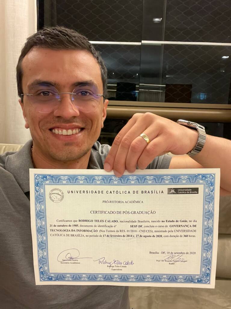 Rodrigo é formado em Gestão de Tecnologia da Informação e é pós-graduado em Governança da Tecnologia da Informação pela Universidade Católica de Brasília. Também recebeu o título de Honra ao Mérito. Para recebê-lo, é necessário o ex-aluno da Universidade ter alcançado reconhecimento nacional e/ou internacional pelos serviços prestados à sociedade, relacionados à formação acadêmica obtida na UCB, em consonância com o perfil do egresso definido no Projeto Político-Pedagógico Institucional da Universidade.