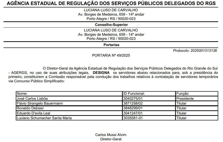 A comissão responsável pela condução do novo concurso AGSUS Temporários para contratação de servidores temporários é formada por equioe que será presidida por José Carlos Lisbôa e contará ainda com os membros Flávio Sirangelo Bauermann, Ronaldo Debiasi, Eduardo D’Avila Leal e Luciano Schumacher Santa Maria, todos designados pelo Diretor-Geral Carlos Mussi Alvim.
