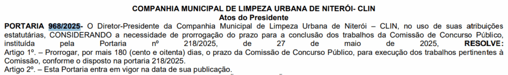 Novidades Concurso CLIN Niterói RJ! A Companhia de Limpeza de Niterói, prorrogou por 180 dias o prazo para conclusão dos trabalhos da comissão organizadora para execução do próximo concurso. Confira o documento a seguir: