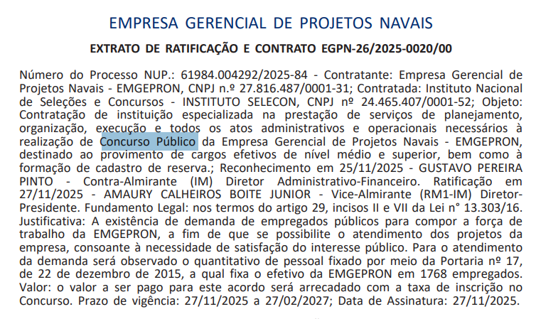 A Empresa Gerencial de Projetos Navais deverá ofertar cargos de nível médio e superior, além da formação de cadastro reserva. O contrato assinado com a banca terá duração de dois anos, com sua vigência sendo finalizada em 27 de fevereiro de 2027.