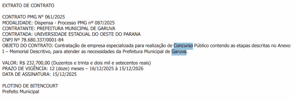 A escolha da banca foi definida por meio de dispensa de licitação, com o prazo de vigência de 12 meses e o valor global de R$ R$ 232.700,00.
