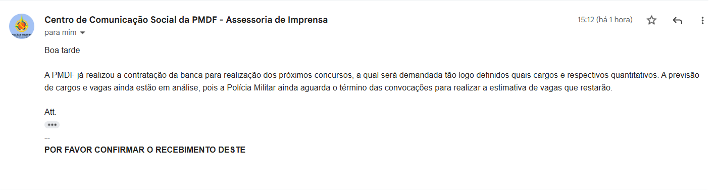 Novidade importante sobre o Concurso PMDF! Em resposta ao Gran, a Polícia Militar do Distrito Federal informou que a previsão de cargos e vagas para novo concurso estão em análise.