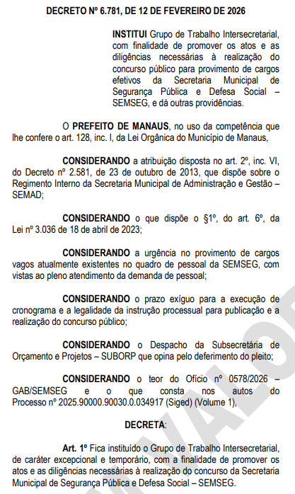 Boas notícias sobre o concurso SEMSEG Manaus AM! Foi formado o grupo de trabalho Intersecretarial, com o objetivo de coordenar os atos e diligências necessários para realização do próximo concurso público da Secretaria Municipal de Segurança Pública e Defesa Social.