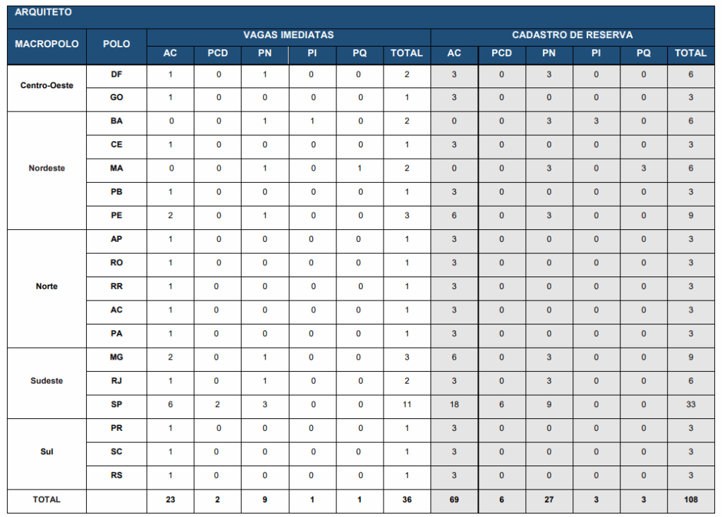Neste conteúdo, você confere a distribuição das vagas por cargo e polo.