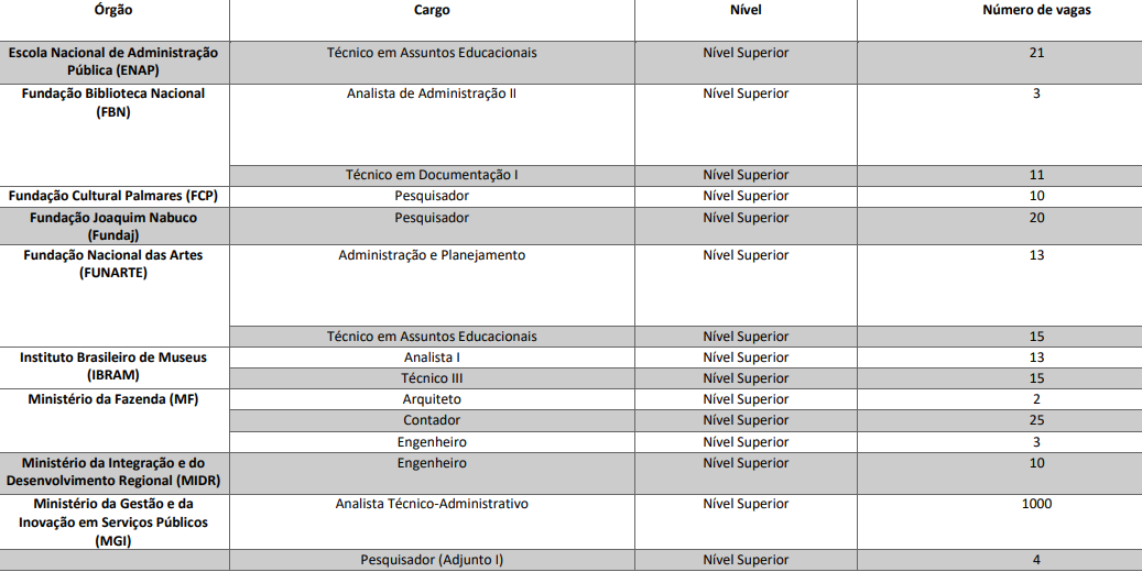 Confira a distribuição detalhada de vagas por cargos nas instituições participantes: