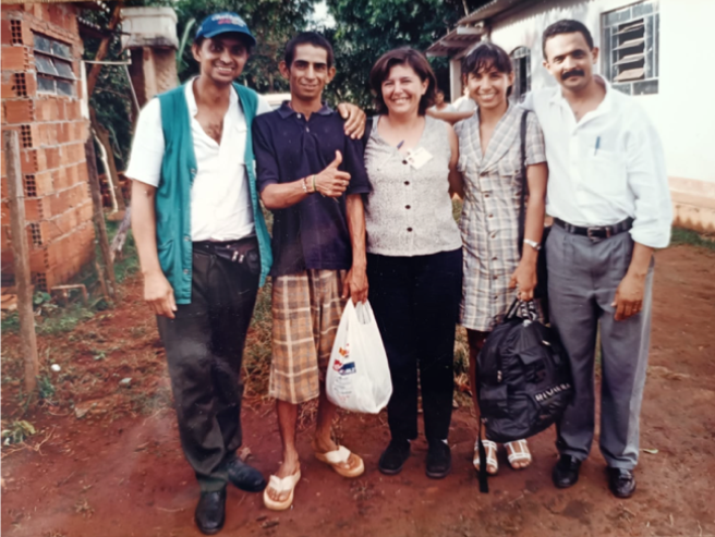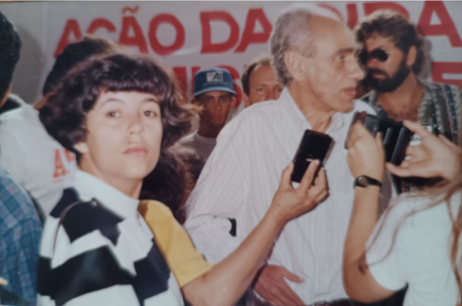 Dois momentos da carreira: entrevistando Betinho, em Goiânia, sobre a campanha Ação da Cidadania contra a Fome, em 1994; e colaborando involuntariamente para um reencontro. O rapaz de bermuda da segunda foto é surdo e havia saído de casa, mas não soube voltar. Ao ver uma reportagem de Carla no jornal O Popular, reconheceu o abrigo em Trindade/GO e pôde, enfim, retornar.