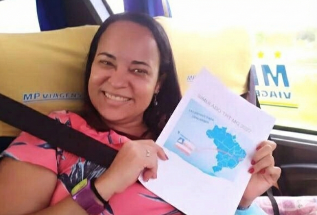 Noemi fazendo simulado no ônibus da excursão para a prova do TRT-MG.