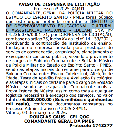 Novidades sobre o concurso PM ES! O Instituto de Desenvolvimento Educacional, Cultural e Assistencial Nacional (IDECAN) será a banca organizadora do próximo edital da Polícia Militar do Espírito Santo.
