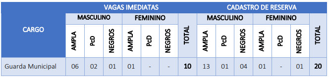 O certame oferta 10 vagas imediatas e 20 vagas para formação de cadastro de reserva para o cargo de Guarda Municipal. Confira a distribuição abaixo: