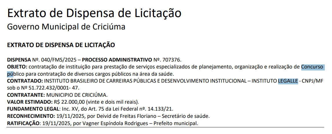 Movimentação importante do Concurso SMS Criciúma SC! Nesta quarta-feira, 19 de novembro de 2025, foi definida a banca organizadora do edital da Secretaria Municipal de Saúde de Criciúma.
