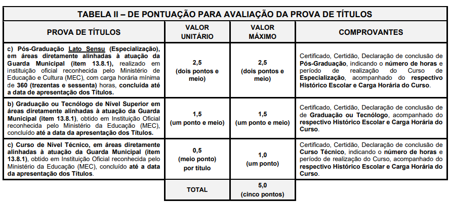 Serão convocados para a prova de títulos os candidatos aprovados no TAF. Serão aceitos os seguintes documentos: