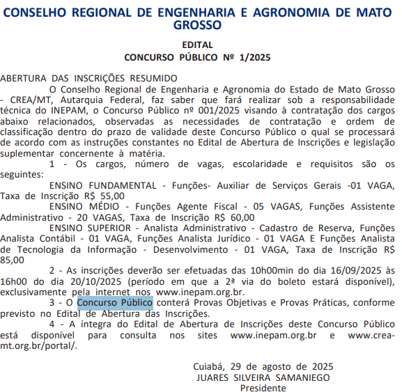O edital de abertura das Inscrições deste concurso público estará disponível para consulta nos sites www.inepam.org.br e www.crea-mt.org.br/portal/.