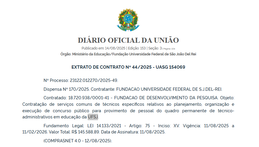 No dia 14 de agosto de 2025 foi publicado no Diário Oficial da União o extrato de contrato com a banca. Veja: