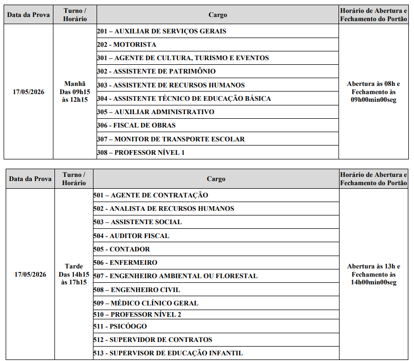 A aplicação da prova ocorrerá, nos turnos da manhã e da tarde, divididos por cargo.