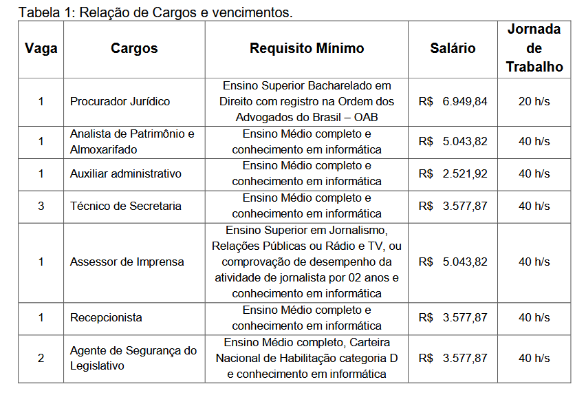 O último edital da Casa foi publicado em 2022 e ofertou 10 vagas imediatas, além de cadastro reserva, para cargos de níveis médio e técnico, com remuneração inicial entre R$ 2.157,08 a R$ 4.314,13.