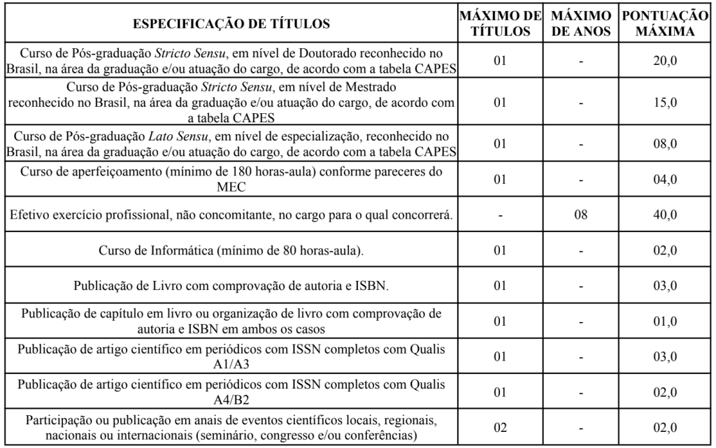 Os títulos apresentados serão avaliados conforme a pontuação especificada no quadro abaixo: