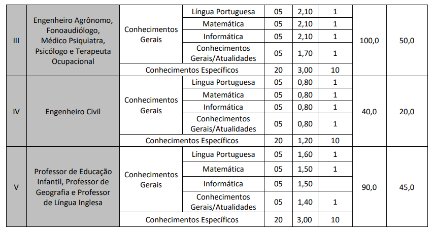 - Prova prática – caráter eliminatório e classificatório, para Auxiliar de Serviços Gerais, Cozinheiro, Engenheiro Civil, Motorista II, Motorista III, Servente de Limpeza, Servente de Obras e Servente/Merendeira,