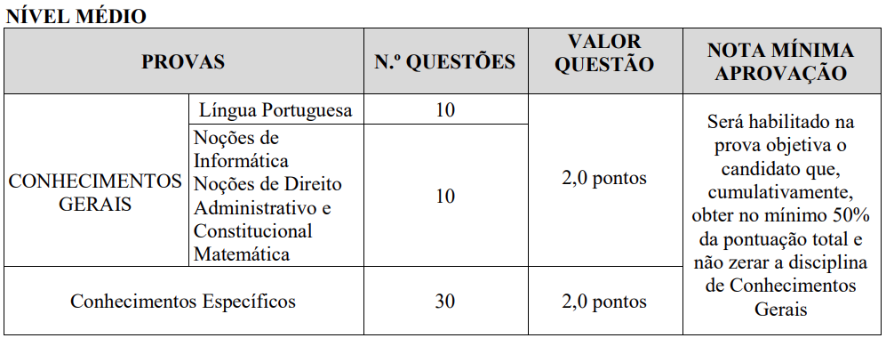A etapa será composta por 50 questões do tipo múltipla escolha (4 alternativas). Será aprovado o candidatos que obtiver, no mínimo, 50% da pontuação disponível.