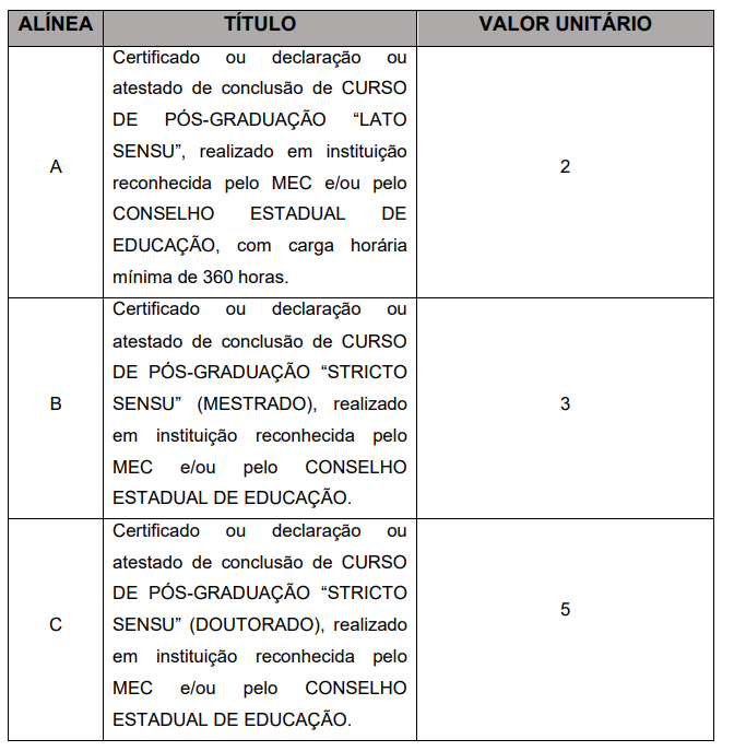 Os títulos poderão ser somados até o limite de 10 (dez) pontos e somente serão considerados aqueles que forem compatíveis com o cargo optado pelo candidato e limitado à apresentação de 01 (um) certificado. Veja a tabela: