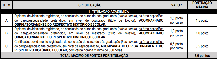 Esta etapa terá a pontuação máxima de 3,0 (três) pontos, apenas podendo ser computado um título por nível (doutorado, mestrado e especialização).