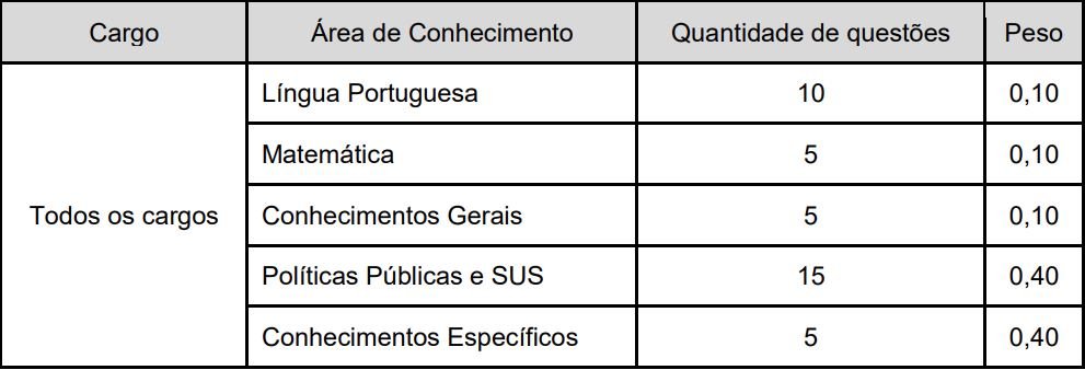 A etapa, de caráter eliminatório e classificatório, foi constituída por 30 questões para Agente Comunitário e 40 questões para médicos e os demais cargos, sendo do tipo múltipla escolha.