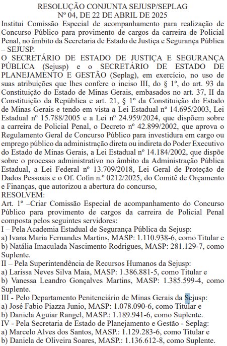 Está oficialmente formada a comissão do novo concurso Polícia Penal MG para efetivos. O documento consta na edição desta quinta-feira (24) do Diário Oficial do Estado. Veja na íntegra!