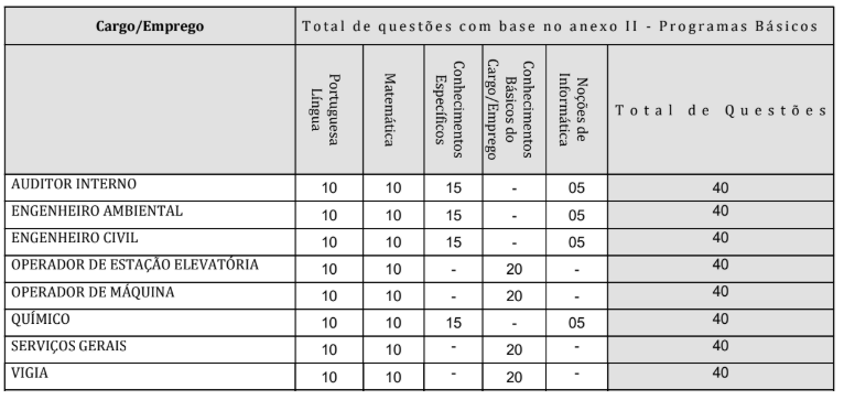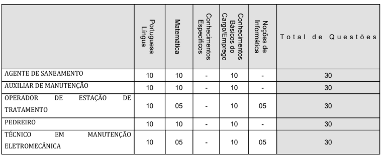 - Prova prática, de caráter eliminatório e classificatório, para AGENTE DE SANEAMENTO, AUXILIAR DE MANUTENÇÃO, OPERADOR DE ESTAÇÃO DE TRATAMENTO, PEDREIRO e TÉCNICO EM MANUTENÇÃO ELETROMECÂNICA.