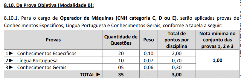 A prova prática, de caráter classificatório e eliminatório, para o cargo de Operador de Máquinas (CNH nas categorias C, D ou E) será realizada no dia 08/11/2025