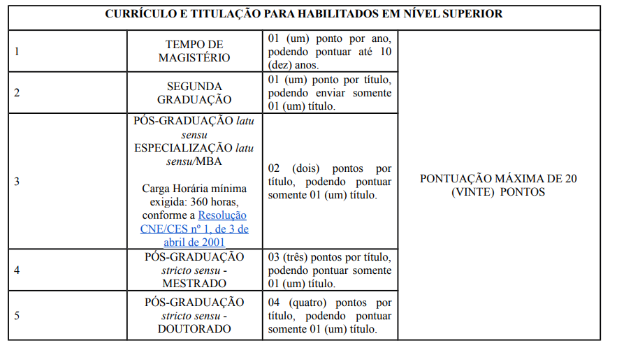- Posteriormente, houve Prova de Títulos, de caráter exclusivamente classificatório, para todos os cargos. Participaram dessa etapa os candidatos com, no mínimo, 40% do total de pontos da Prova Nacional Docente (PND). Confira a tabela: