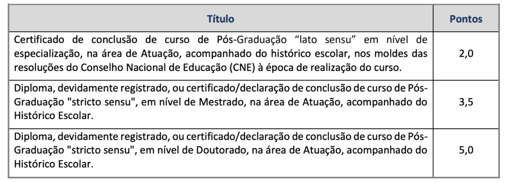 A prova de títulos, de caráter facultativo, somatória para os aprovados na prova objetiva, será para todos os cargos do nível superior. A pontuação total atribuída ao quesito não será superior a 05 (cinco) pontos.