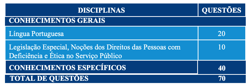 O quadro a seguir apresenta as disciplinas e o número de questões: