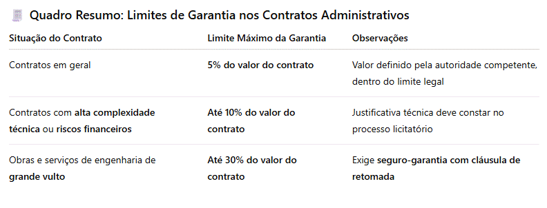 De modo geral, a lei estabelece o limite máximo de 5% (cinco por cento) do valor do contrato. Porém, em contratos com alta complexidade técnica ou com riscos financeiros consideráveis, a garantia pode chegar até o limite máximo de 10% (dez por cento).