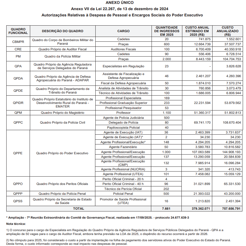 Ademais, apesar da previsão dos editais de concurso público para a área da educação e para a PGE-PR, a realização dos certame ainda dependerá do espaço orçamentário e da autorização do estado.