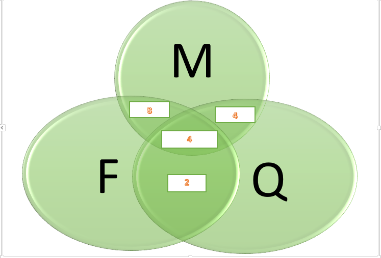 - F∩Q = 6(dado na questão) – 4(quem faz as 3 matérias) = 2
