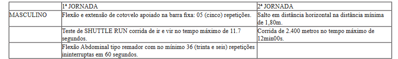 O exame da avaliação de condicionamento físico será realizado em 2 jornadas e consistirá dos exercícios especificados a seguir, a serem realizados na sequência ora apresentada: