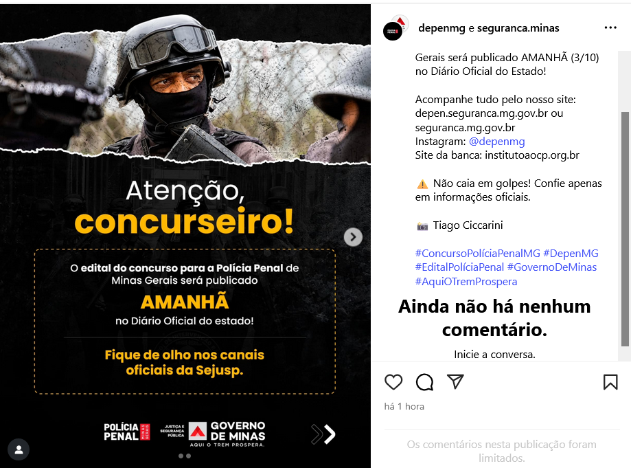 O edital do novo concurso da Polícia Penal de Minas Gerais (SEJUSP/MG) será publicado nesta sexta-feira (3/10), no Diário Oficial do Estado.
