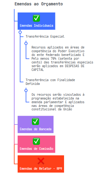 Por fim, há(havia) as emendas de RELATOR. Aqui, senhores, eram emendas em que o relator do projeto da LOA(Toda lei tem um relator que recebe sugestões e emite parecer final) poderia emendar o orçamento atendendo a pedidos de outros parlamentares. Entretanto, em julgado recente, o Supremo Tribunal Federal limitou bastante essas emendas, chamadas de RP9. Observem trecho do julgado: