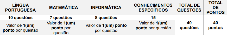 A avaliação será composta por 40 questões objetivas de múltipla escolha, de acordo com a tabela: