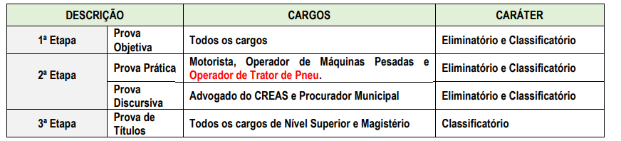 Retificação 1: – 21/10 altera Escolaridade e carga horária de cargos; EXCLUI a exigência da Carteira Nacional de Habilitação como requisito de cargos específicos; altera item de atribuições e INCLUI Operador de Trator de Pneu na Prova PRÁTICA.