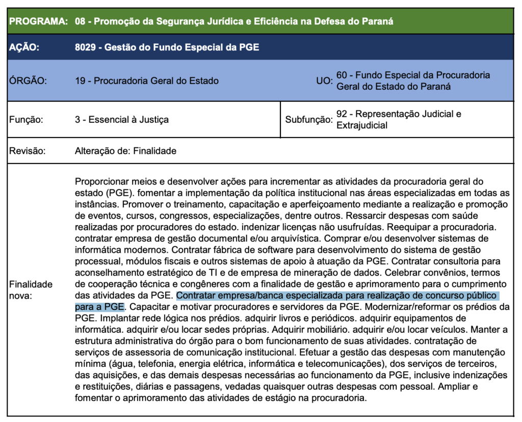 De acordo com o Projeto de Lei Orçamentária para o ano de 2026, enviado à Assembleia Legislativa para análise, há a previsão de contratação de empresa/banca especializada para a realização de concurso público para a PGE.