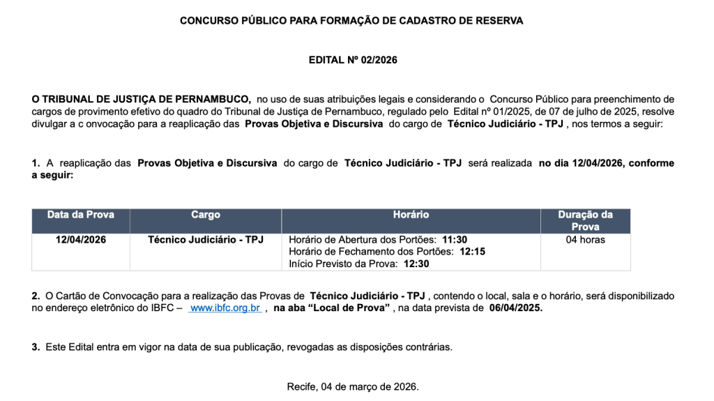 De acordo com a informação, as provas serão aplicadas em 12 de abril e o local de prova dos candidatos será divulgado no dia 6 do mesmo mês, no site do IBFC.
