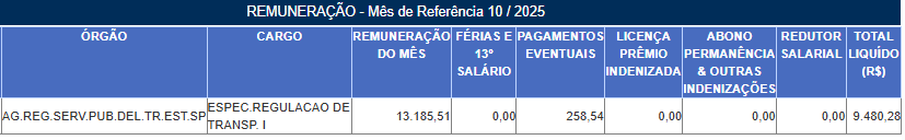 - Total líquido = Remuneração do Mês + férias e 13º salário + Pagamentos Eventuais + Licença Prêmio Indenizada + Abono de permanência & Outras Indenizações, deduzidos o Redutor salarial e os Descontos Obrigatórios (previdência, assistência médica, IRRF, pensão alimentícia, dentre outros) e Descontos autorizados (associações, sindicatos, agentes financeiros, dentre outros).