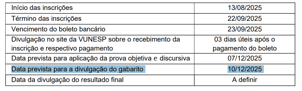 As provas do concurso TJ SP foram aplicadas em 7 de dezembro de 2025, no período da tarde. Os gabaritos preliminares estão previstos para o dia 10 de dezembro, com abertura do período de interposição de recursos.