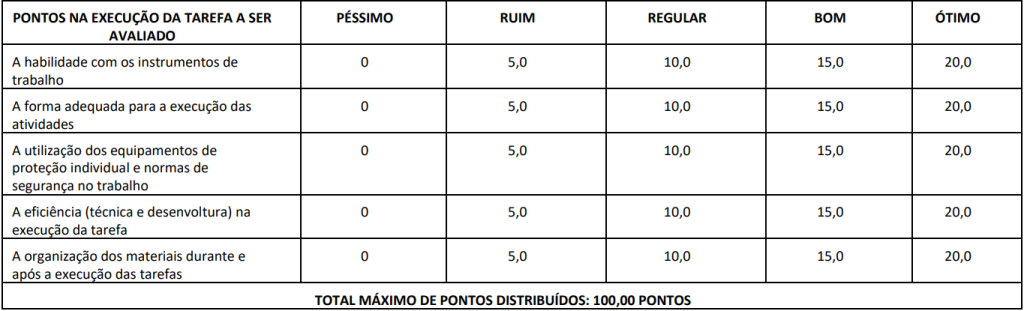 Pontuação da prova prática para Auxiliar de Manutenção