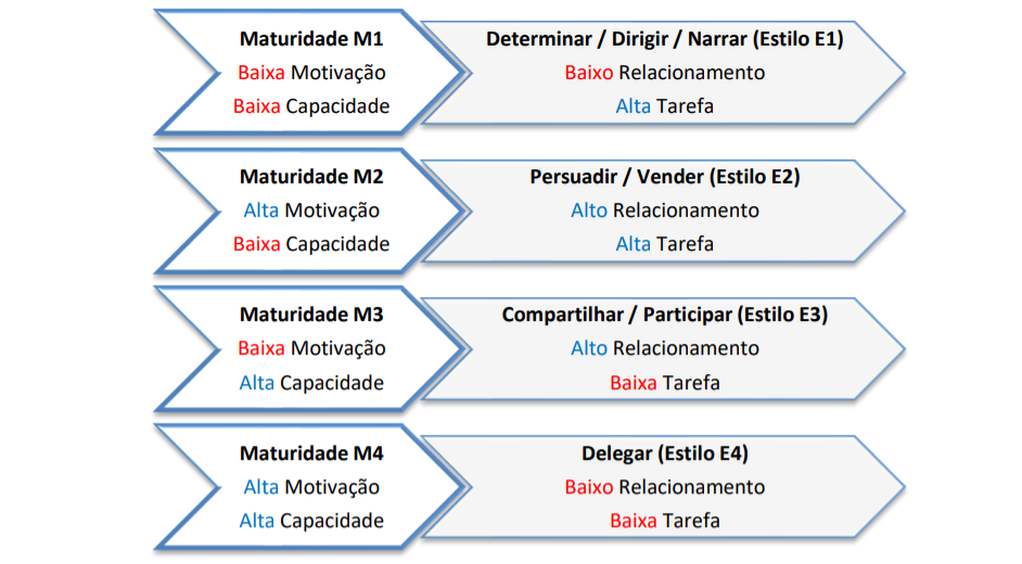 Nesse sentido, de acordo com as variáveis motivação e capacidade/competência, Hersey e Blanchard destacaram 4 níveis de maturidade que um funcionário pode apresentar para a realização de determinada tarefa. São eles: