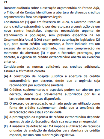 - A letra D também está correta, pois conforme Manual Técnico do Orçamento 2025 (pág. 159), “A reabertura de créditos extraordinários pode ser feita por ato do Poder Executivo em qualquer data, mediante solicitação do órgão ou Poder interessado”. Dessa forma, cabe apenas ao Executivo a reabertura do crédito extraordinário, ainda que isso tenha sido solicitado por outro Poder ou órgão, razão por que a alternativa não apresenta erro que possa invalidá-la.