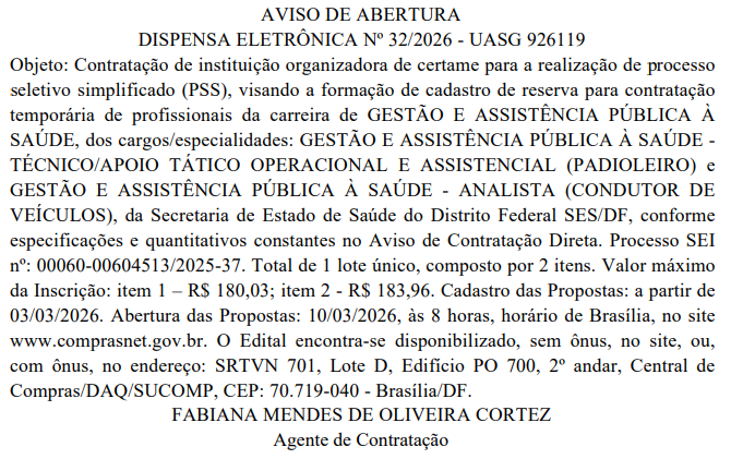 A banca organizadora do novo processo seletivo simplificado para a Secretaria de Saúde do Distrito Federal (SES DF) será revelada no dia 10 de março de 2026.