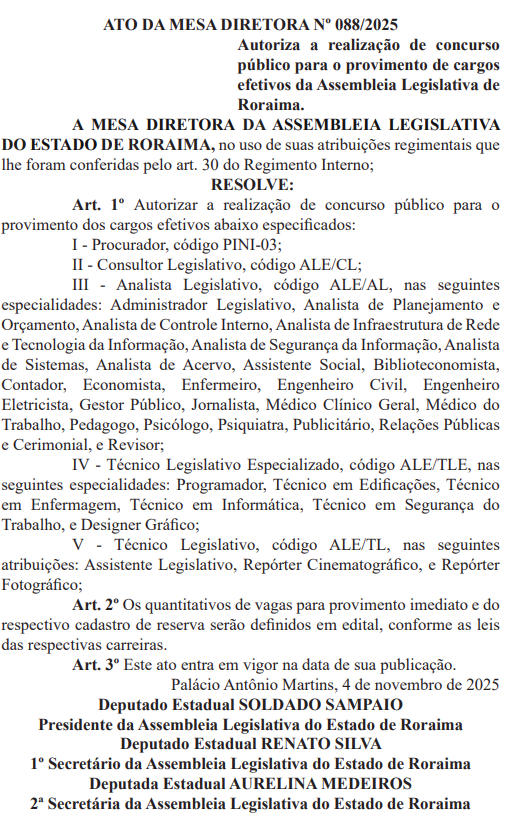 O novo edital do concurso ALE RR (Assembleia Legislativa de Roraima) está oficialmente autorizado! O documento foi divulgado no Diário Oficial do Estado.