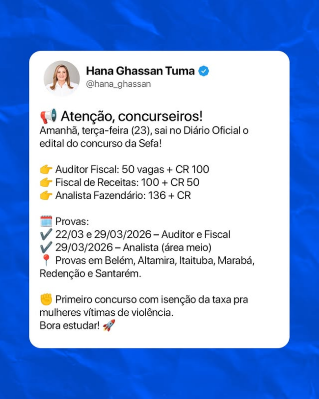 O aguardado edital do concurso Sefa PA (Secretaria da Fazenda do Estado do Pará) será publicado amanhã (23) no Diário Oficial do Pará, segundo informações da vice-governadora Hana Ghassan Tuma.