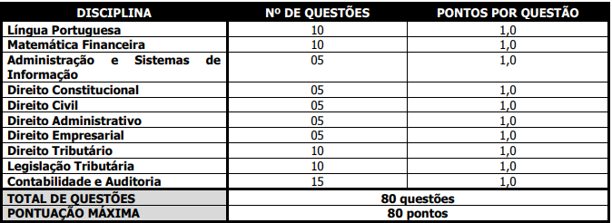 Foram aplicadas provas escritas objetivas de múltipla escolha, de caráter eliminatório e classificatório, abrangendo as seguintes disciplinas: